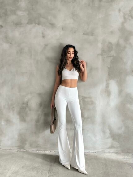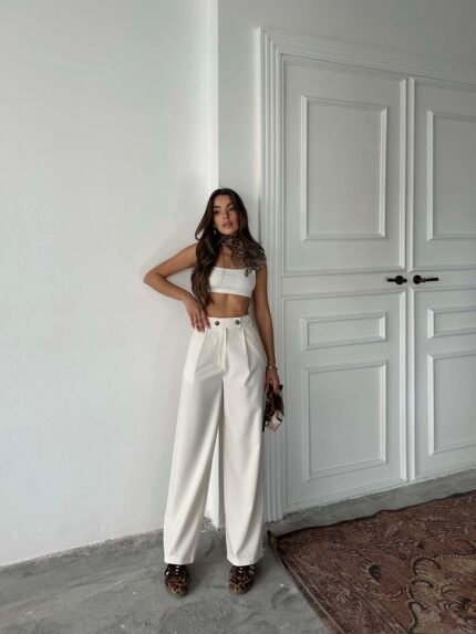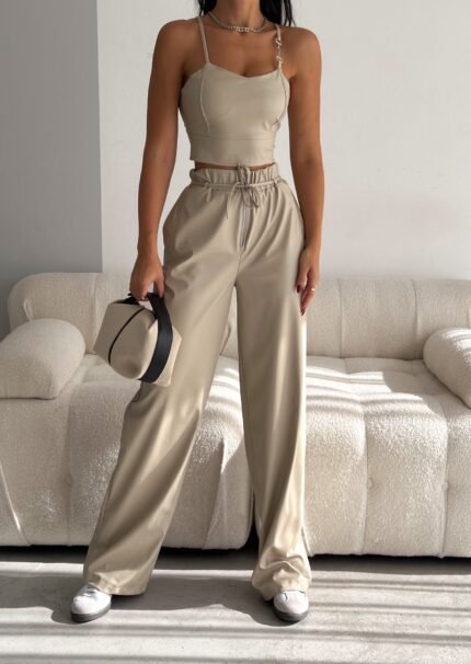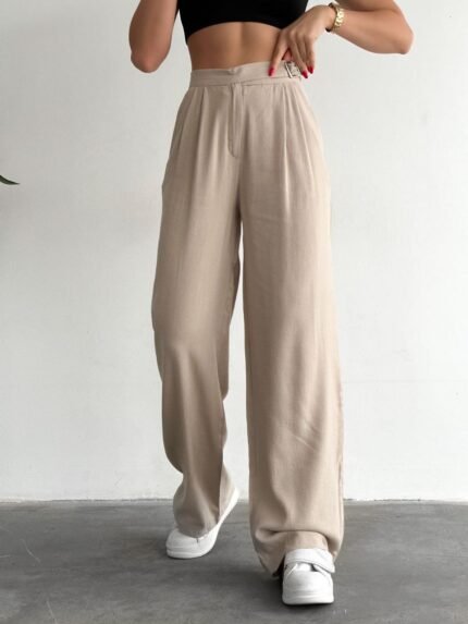 Bej Poliviskon Çift Düğme Palazzo Pantolon