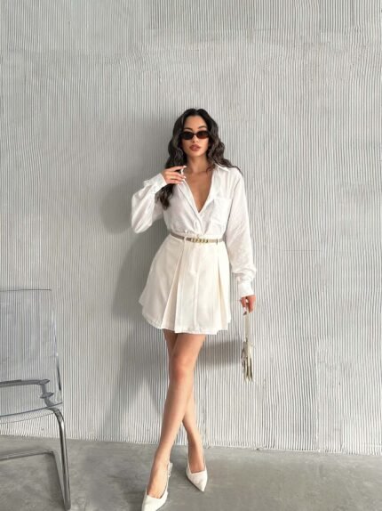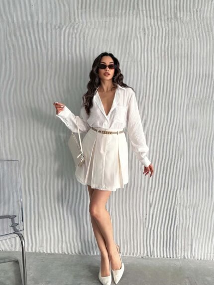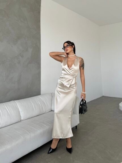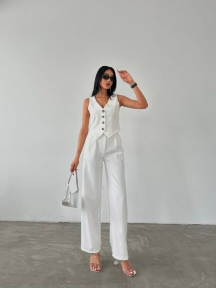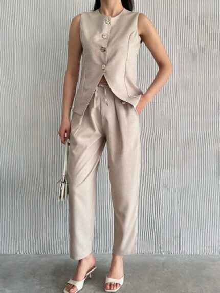 Bej Altın Düğmeli Yelekli Pileli Pantolon Takım