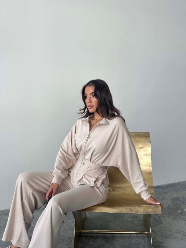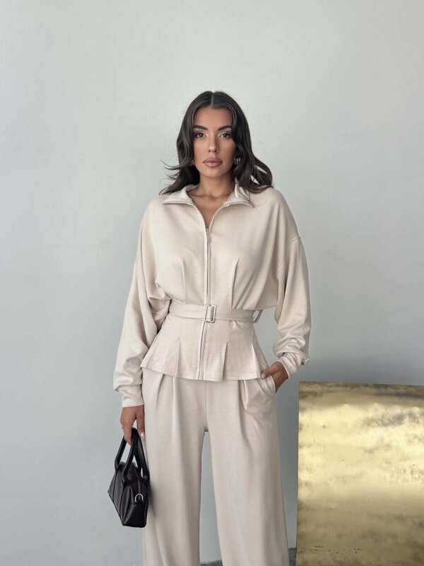 Alt: Yüksek bel, cepli ve geniş paça pantolonu sayesinde gün boyu konfor ve özgür hareket alanı sağlar.