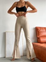 Bej Ön Yırtmaçlı Deri İspanyol Paça Pantolon