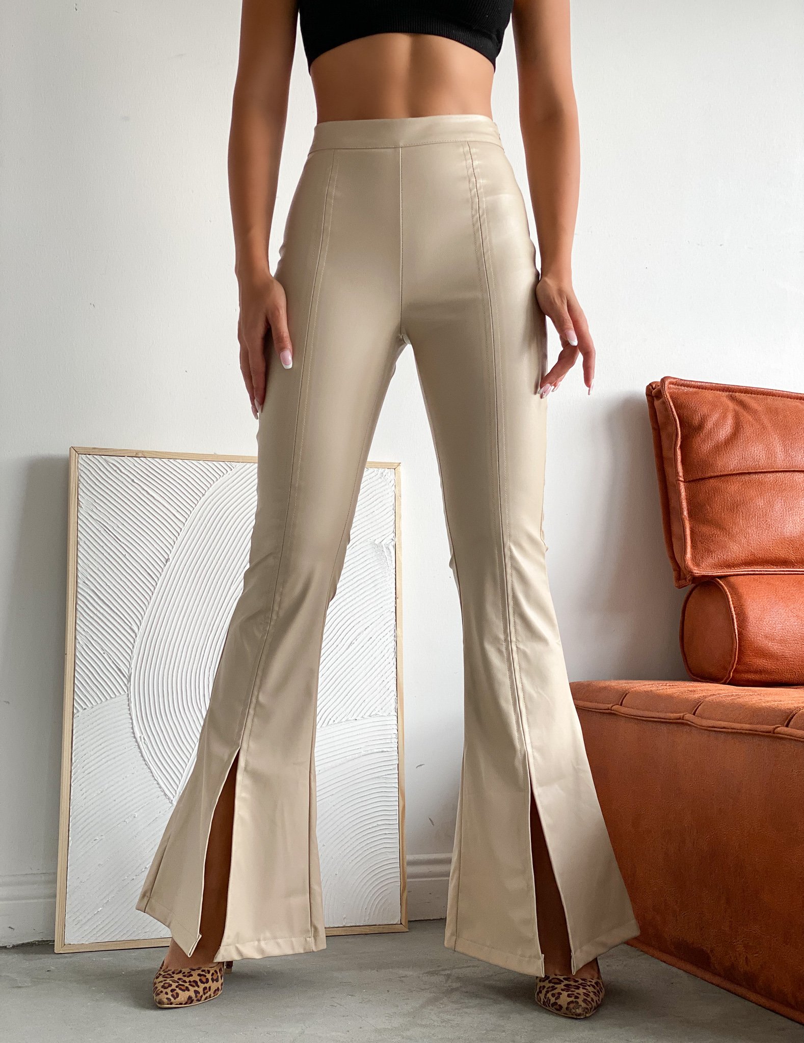 Ön Yırtmaçlı Deri İspanyol Paça Pantolon – Cesur ve Çarpıcı Bir Stil