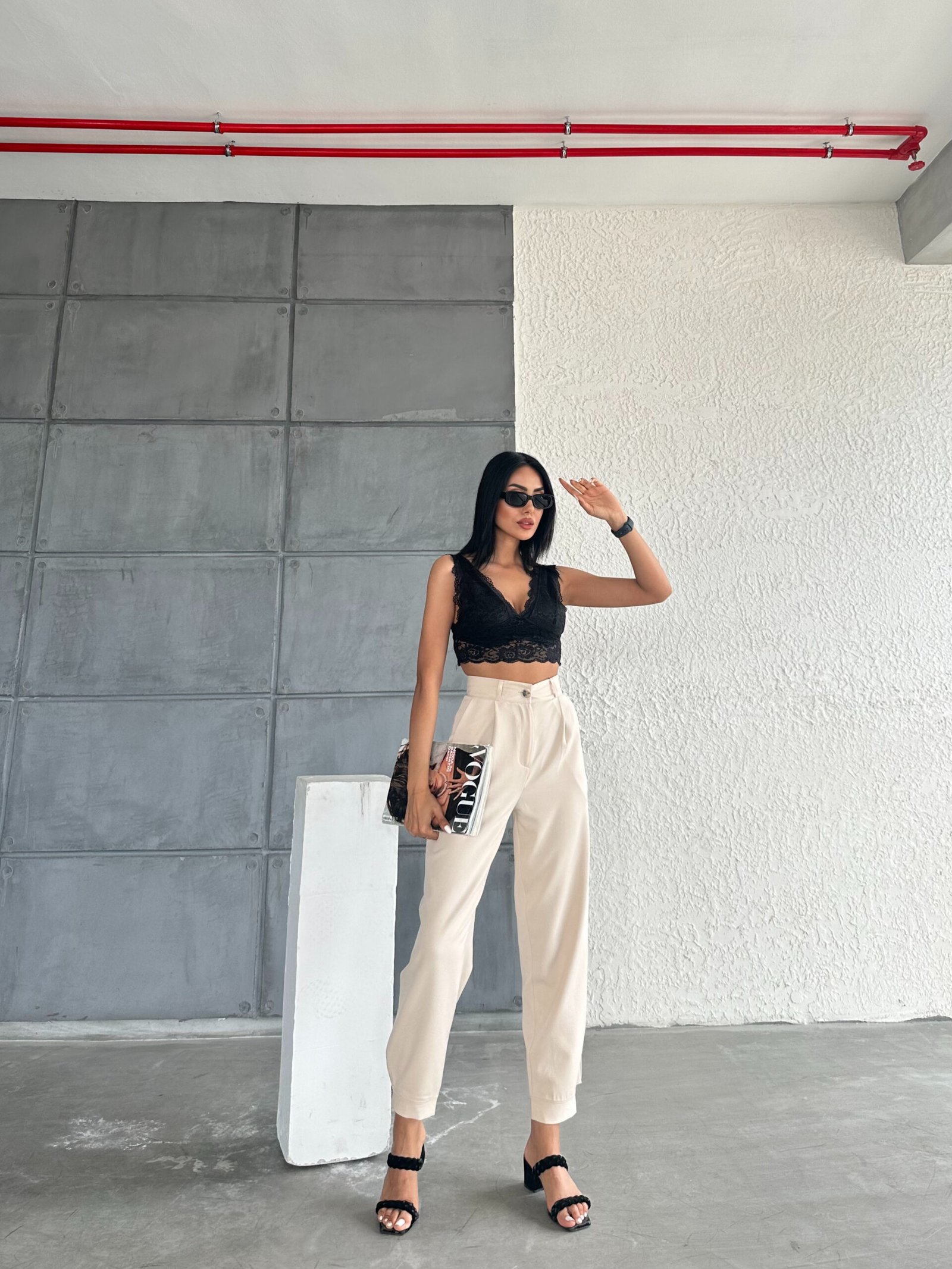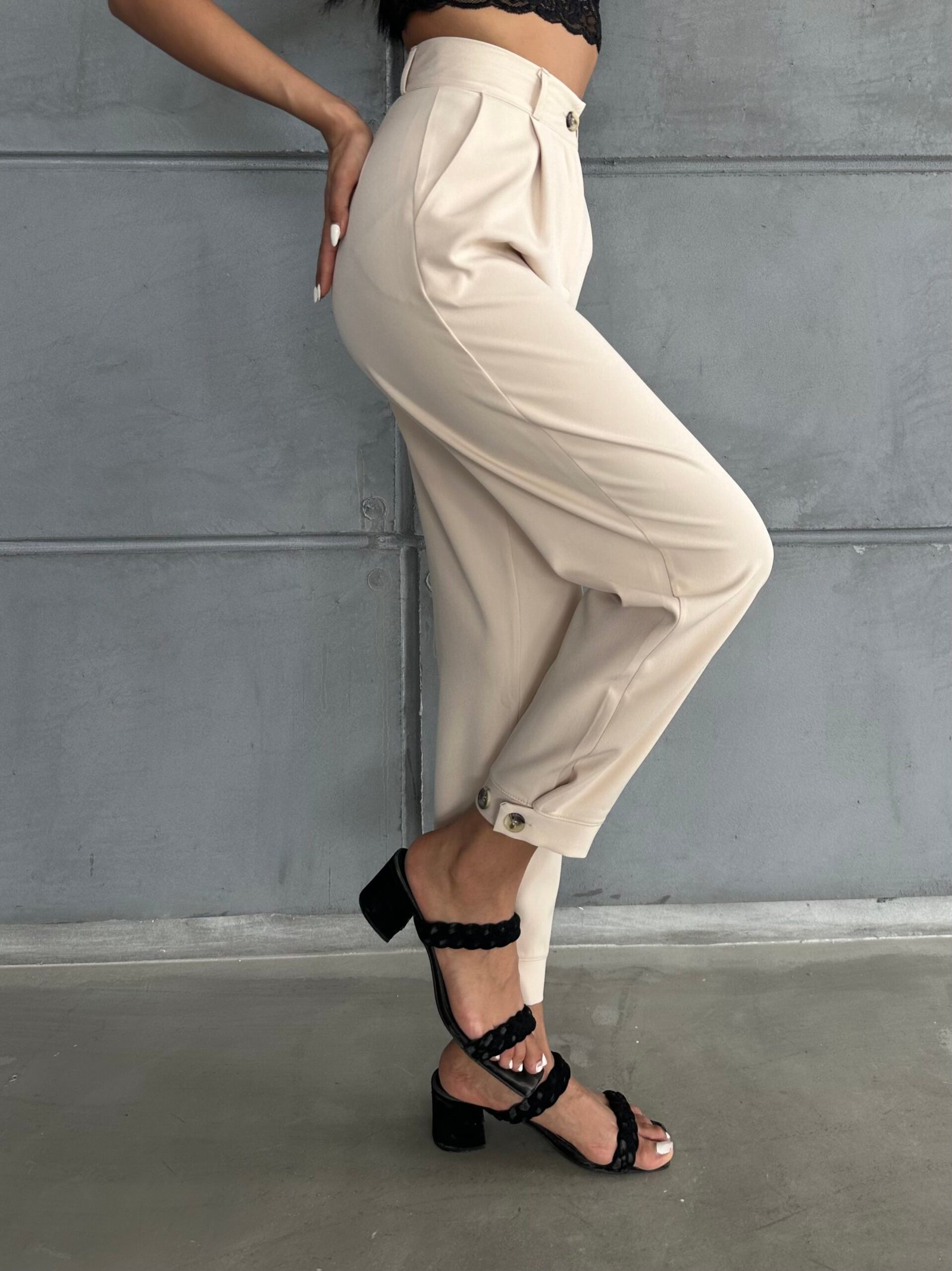 Beyaz Paçası Düğmeli Atlas Pantolon