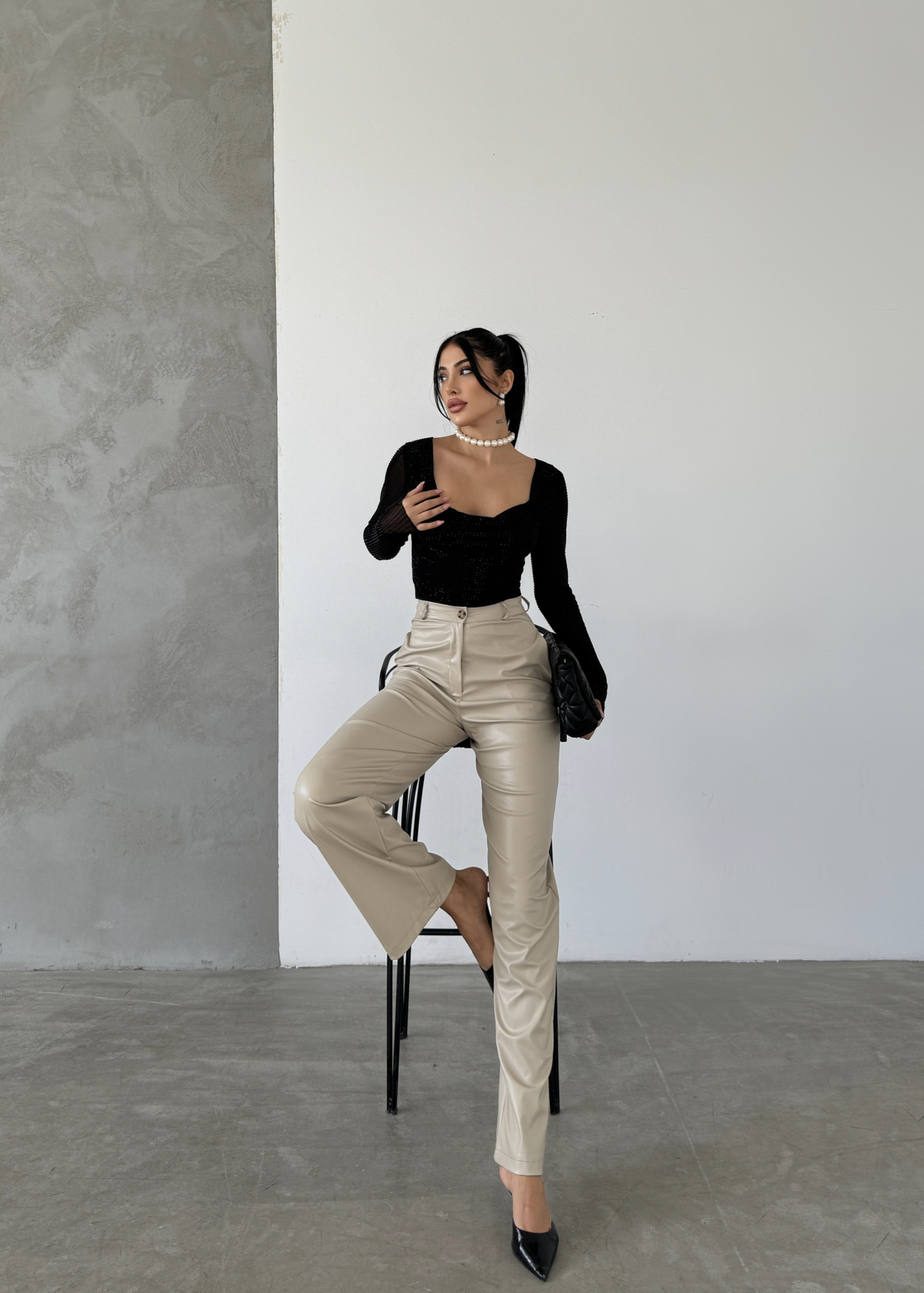 Bu palazzo deri pantolon, mağazalarınıza çarpıcı ve modern bir stil kazandırır. Deri görünümüyle iddialı bir duruş sergileyen pantolon, palazzo kesimi sayesinde rahatlığı da ön planda tutar. Geniş paça tasarımı, her adımda akıcı bir siluet sunarken, pantolona zarif bir hava katar.