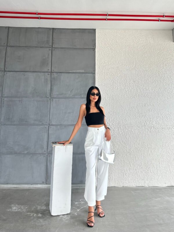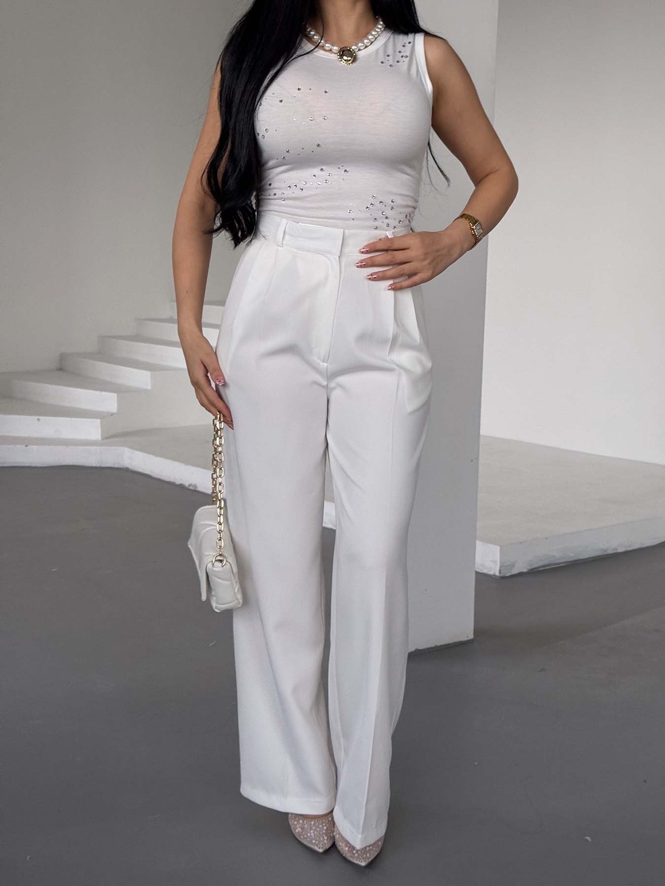 Beyaz Paçası Düğmeli Atlas Pantolon
