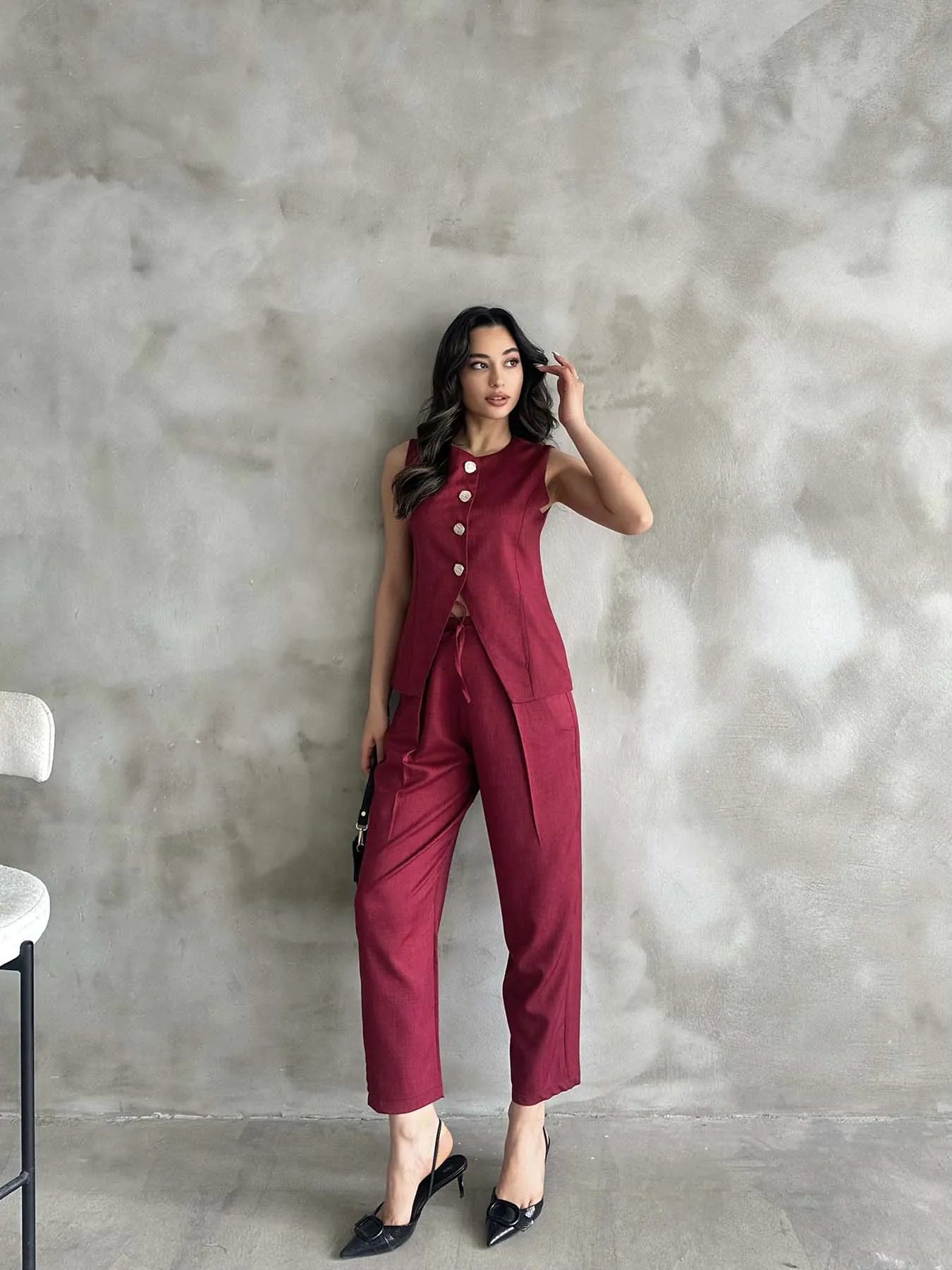 Bordo Altın Düğmeli Yelekli Pileli Pantolon Takım