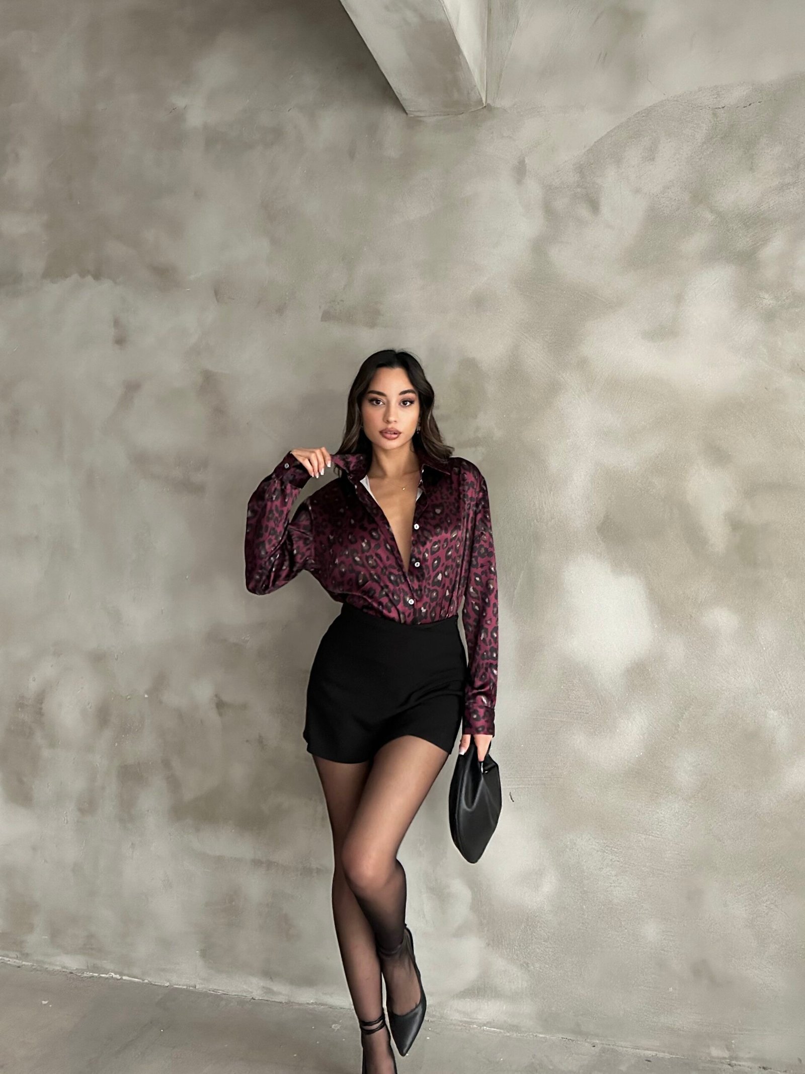 Bordo Leopar Desenli Saten Oversize Gömlek