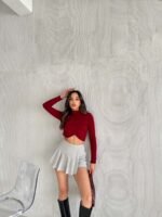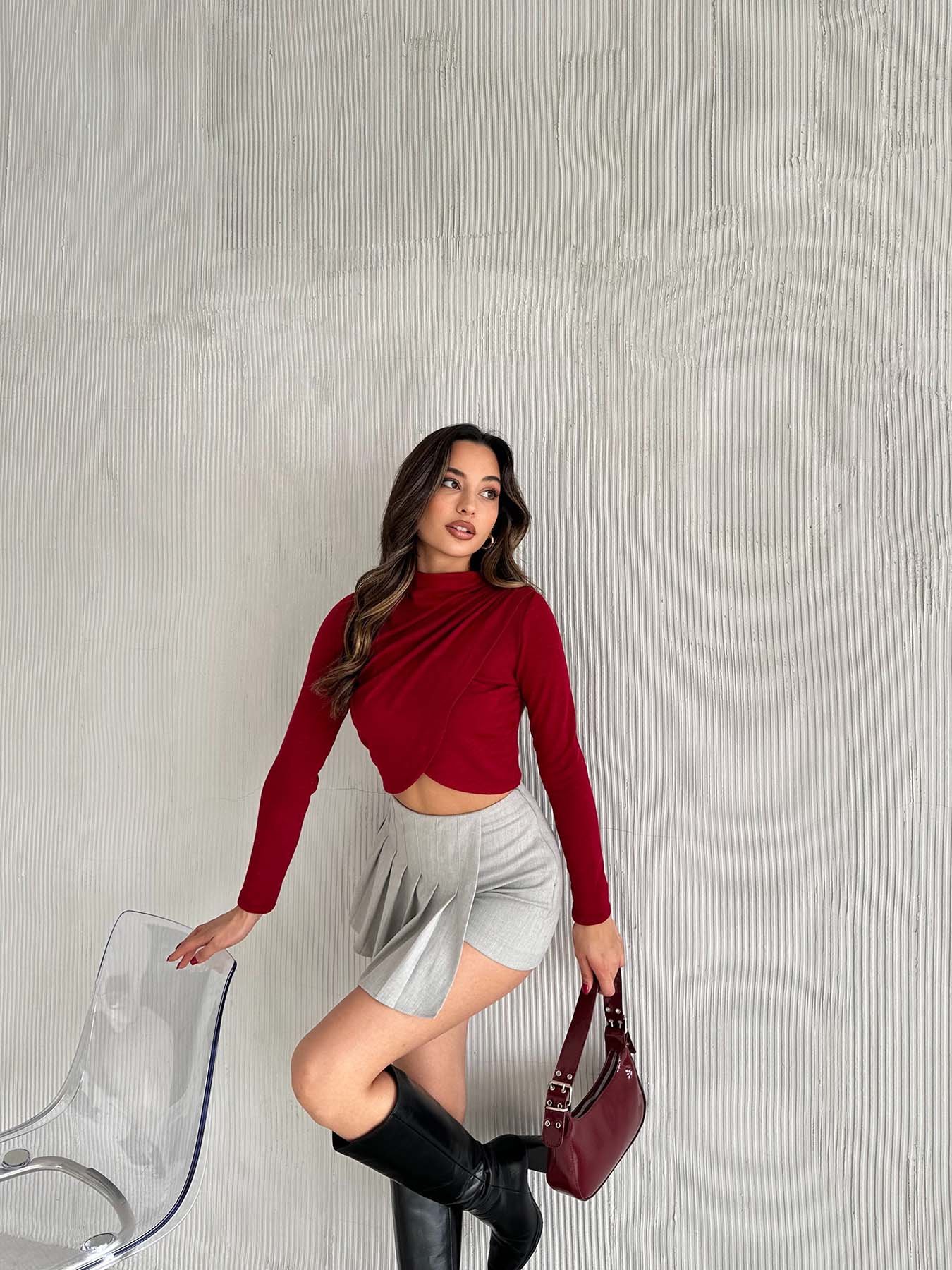 Bordo Omuz Büzgülü Kruvaze Çilek Bluz