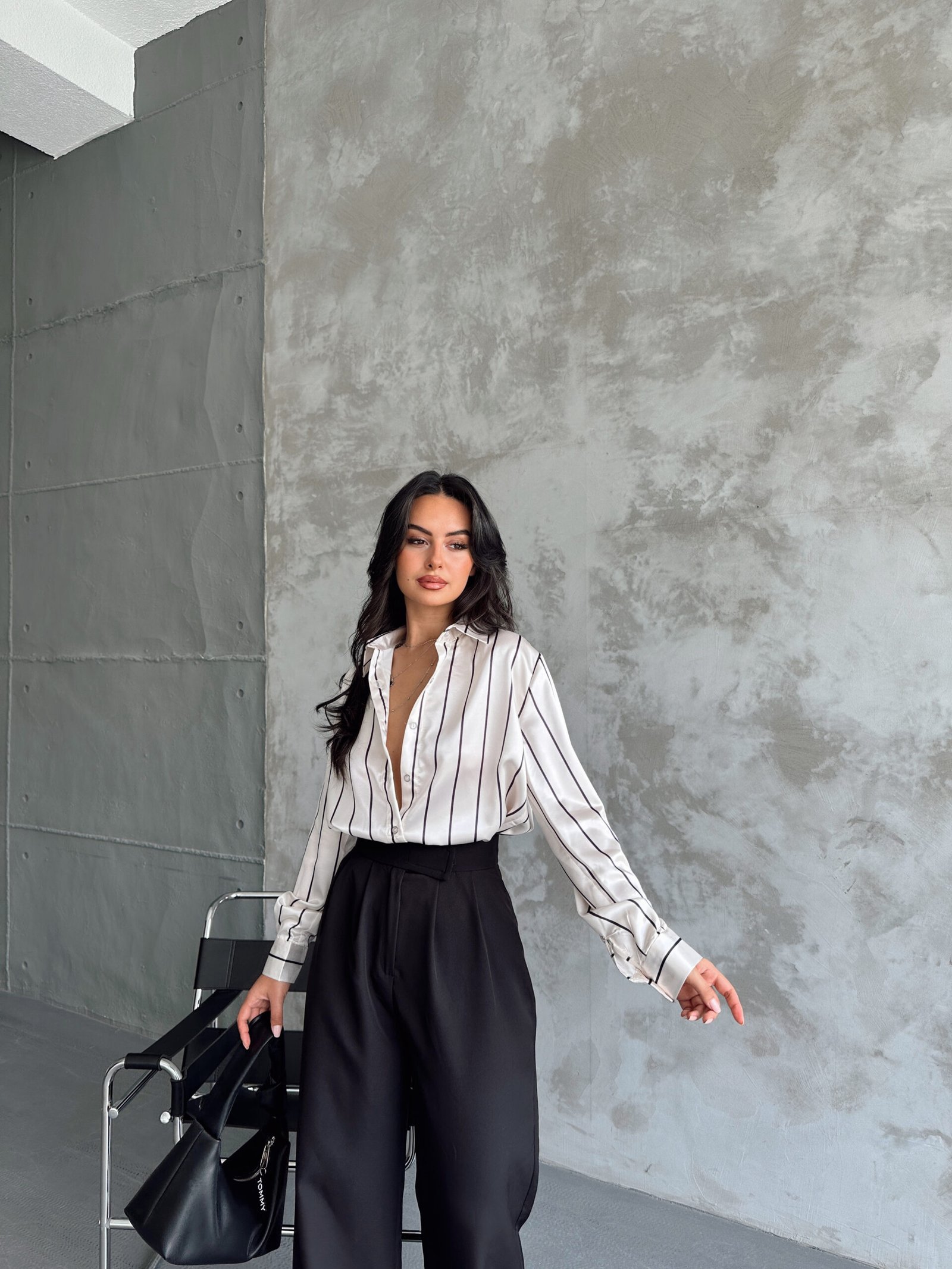 Çizgi Desenli Saten Oversize Gömlek
