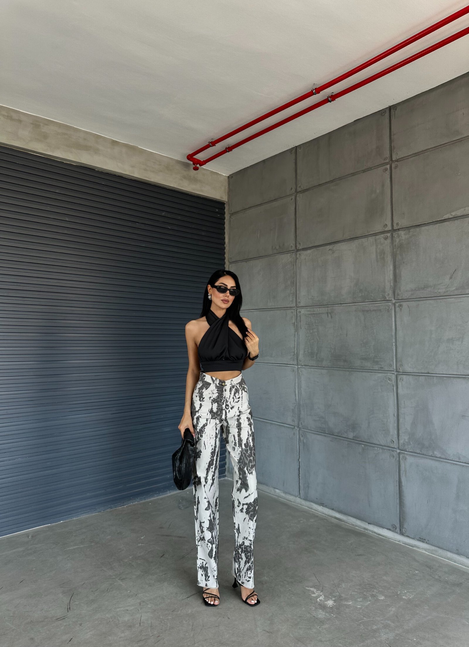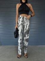Gri Leopar Gabardin Kumaş Palazzo Pantolon