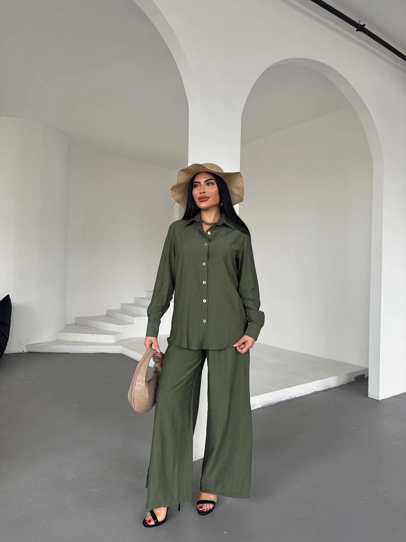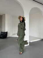 Haki Çilek Gömlek Yırtmaçlı Pantolon Takım