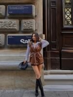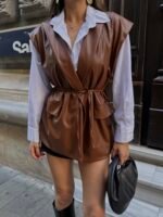 Kahve Bağlamalı Ceket Yaka Deri Yelek