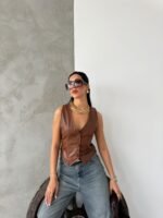 Bu siyah deri astarlı yelek, sıradanlığa meydan okuyan bir duruş sergileyenler için tasarlandı. Dış yüzeyin keskin hatları ve deri dokusunun ikonik havası, astarın sunduğu konforla birleşerek şıklık ve rahatlığı bir araya getiriyor. Siyah rengin asil cazibesi ile modern kesimi, bu yeleği sokak modasından gece şıklığına kadar geniş bir yelpazede kullanılabilir hale getiriyor.