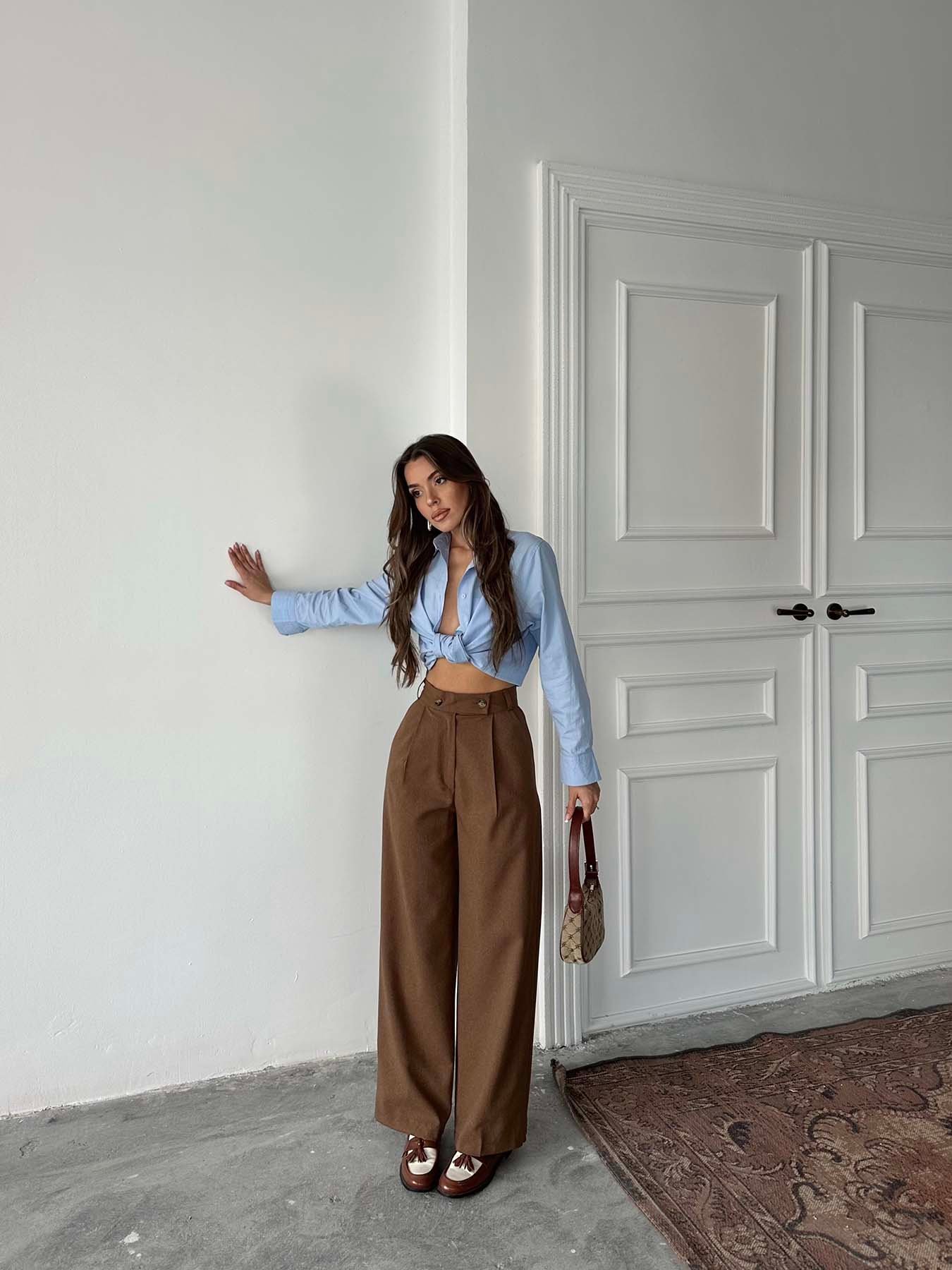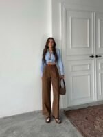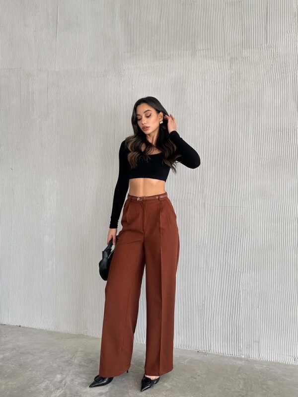Kahve Poliviskon Çift Düğme Palazzo Pantolon