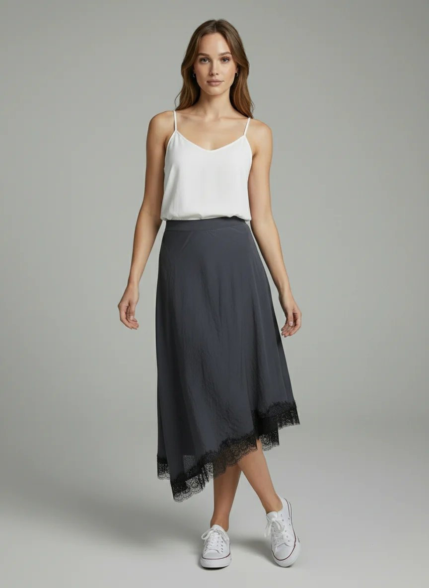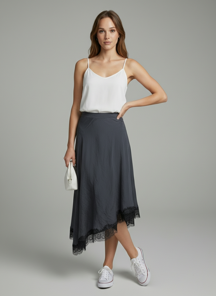 Lacivert Eteği Dantelli Modal Asimetrik Etek