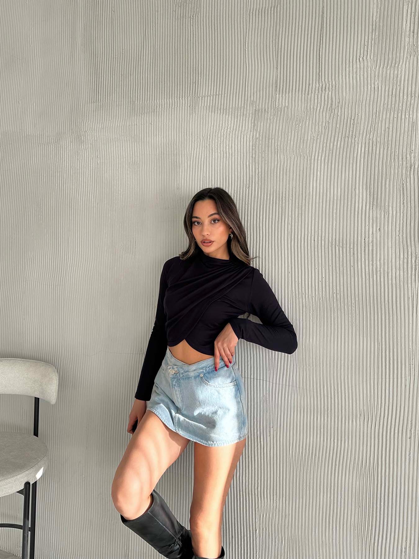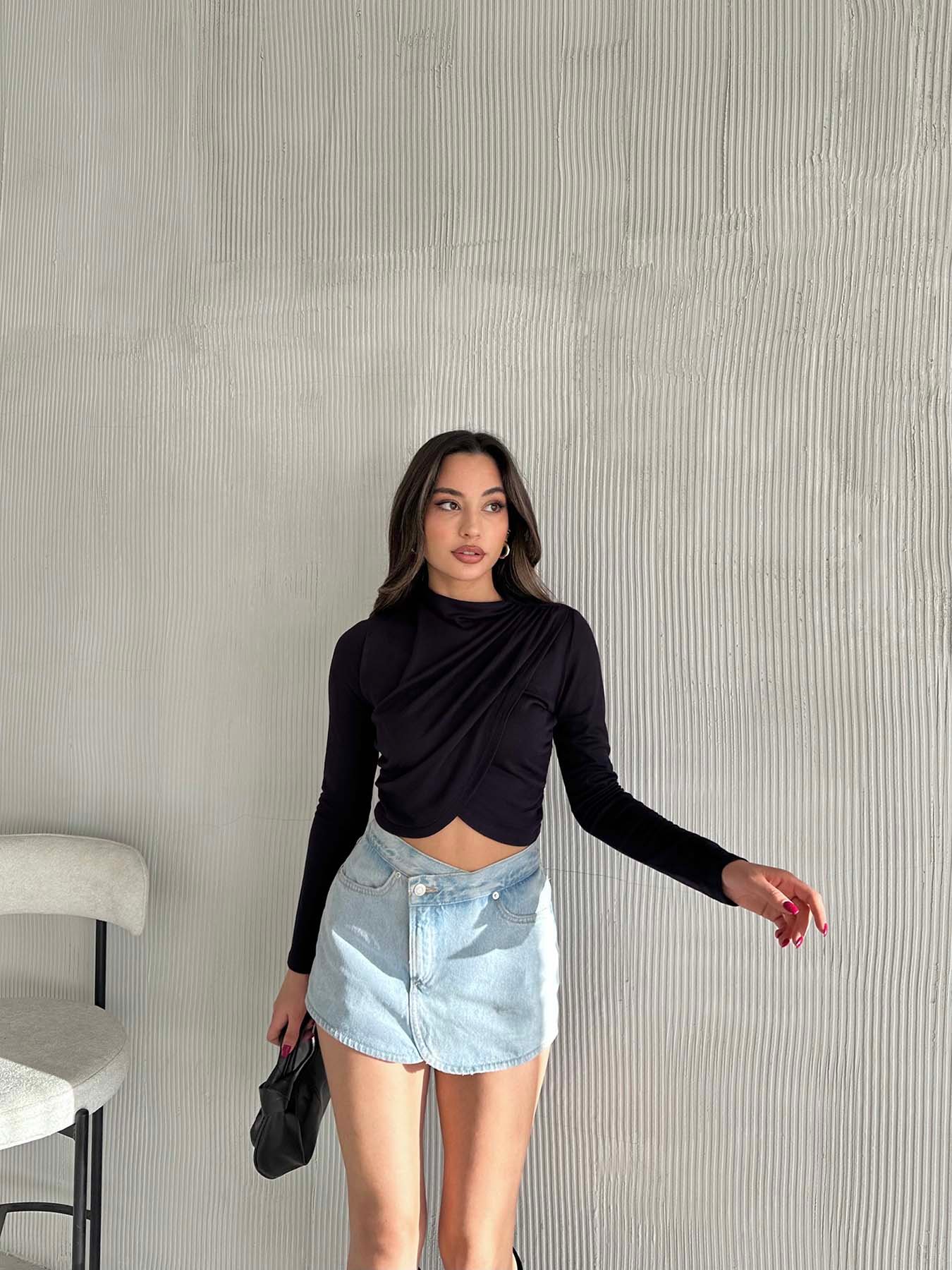 Lacivert Omuz Büzgülü Kruvaze Çilek Bluz