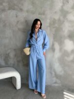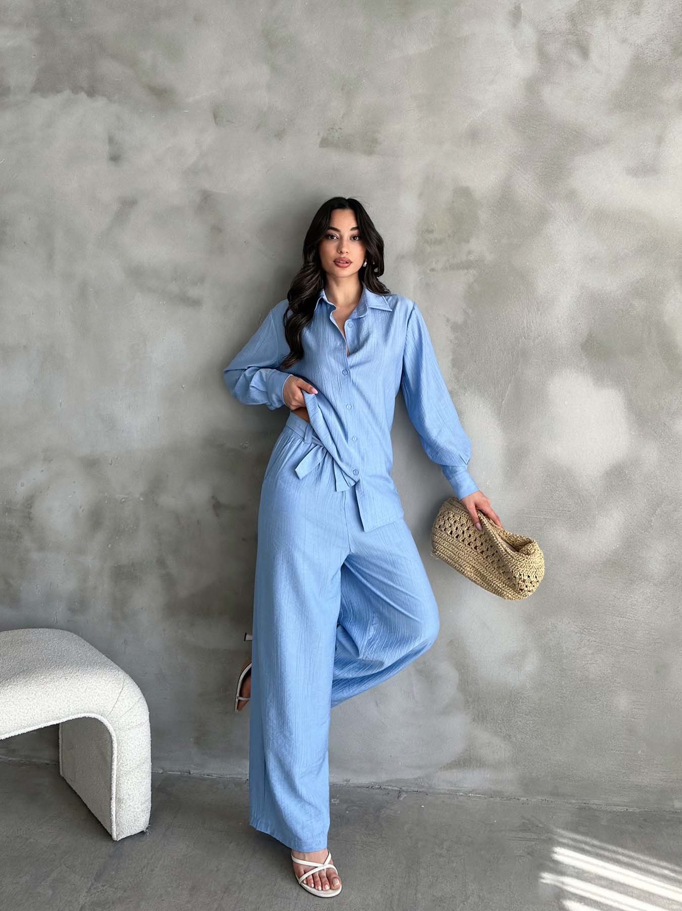 Mavi Çilek Gömlek Yırtmaçlı Pantolon Takım