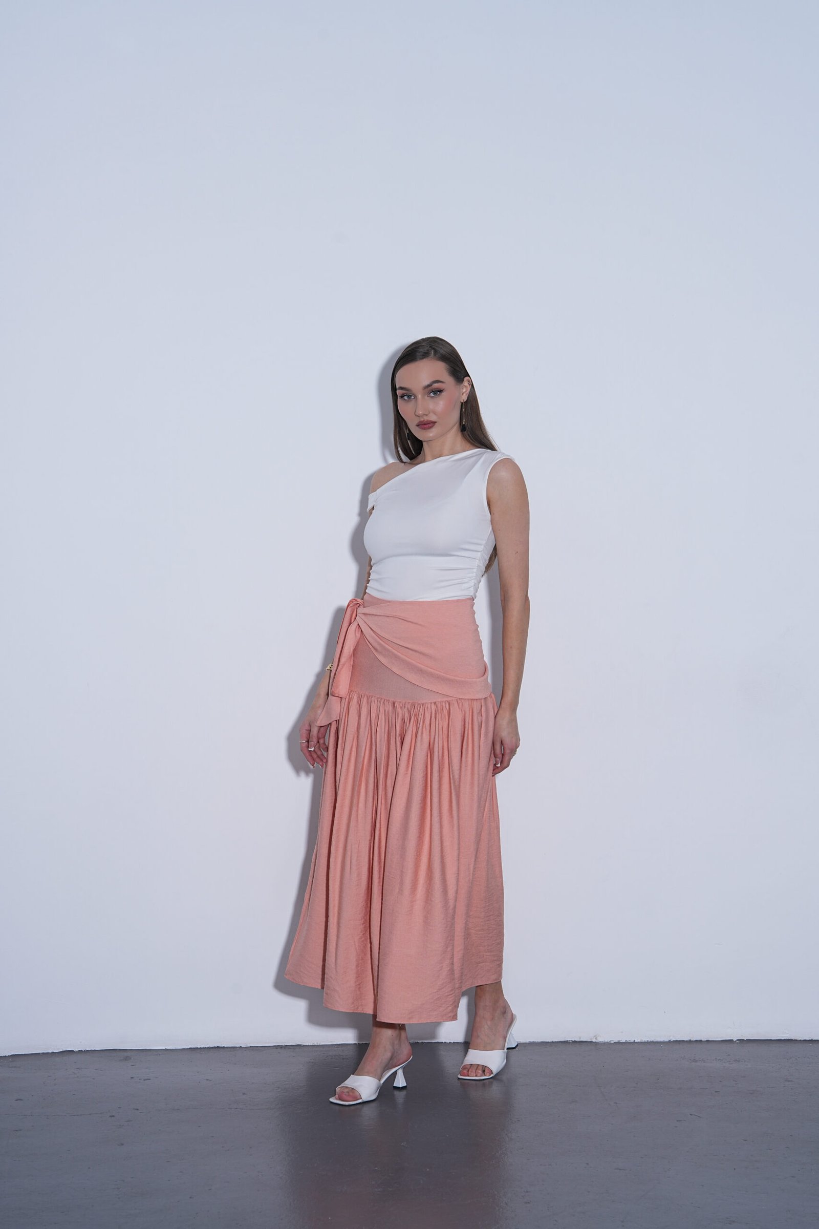 Pudra Kuşaklı Keten Maxi Etek ile zarafeti şıklıkla buluşturun. Bu etek, yaz gardırobunuzun vazgeçilmez parçası olmak için tasarlandı. Doğal keten kumaşı, hem nefes alabilir yapısıyla gün boyu konfor sunar hem de özgürce hareket etmenizi sağlayan asil bir döküme sahiptir. Uzun boyu ve akıcı siluetiyle her anı özel kılar; plajda, şehir içinde bir buluşmada veya romantik bir akşam yemeğinde mükemmel bir seçimdir.