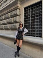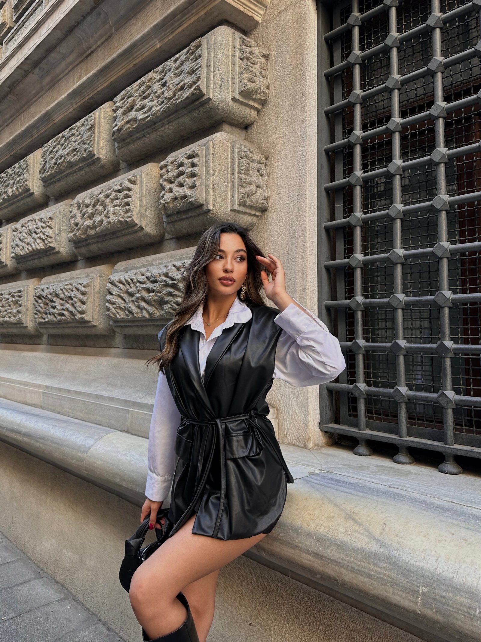 Siyah Bağlamalı Ceket Yaka Deri Yelek