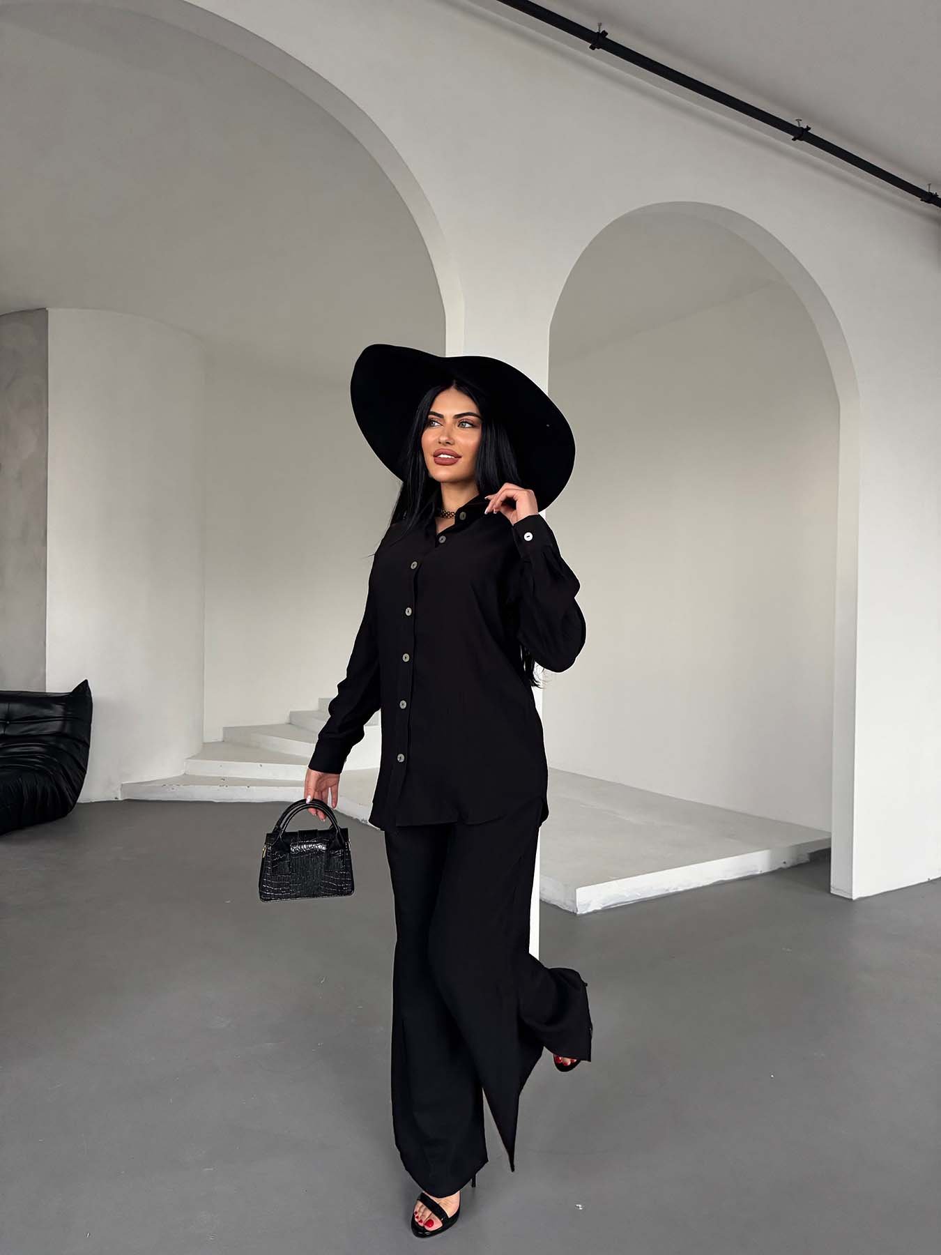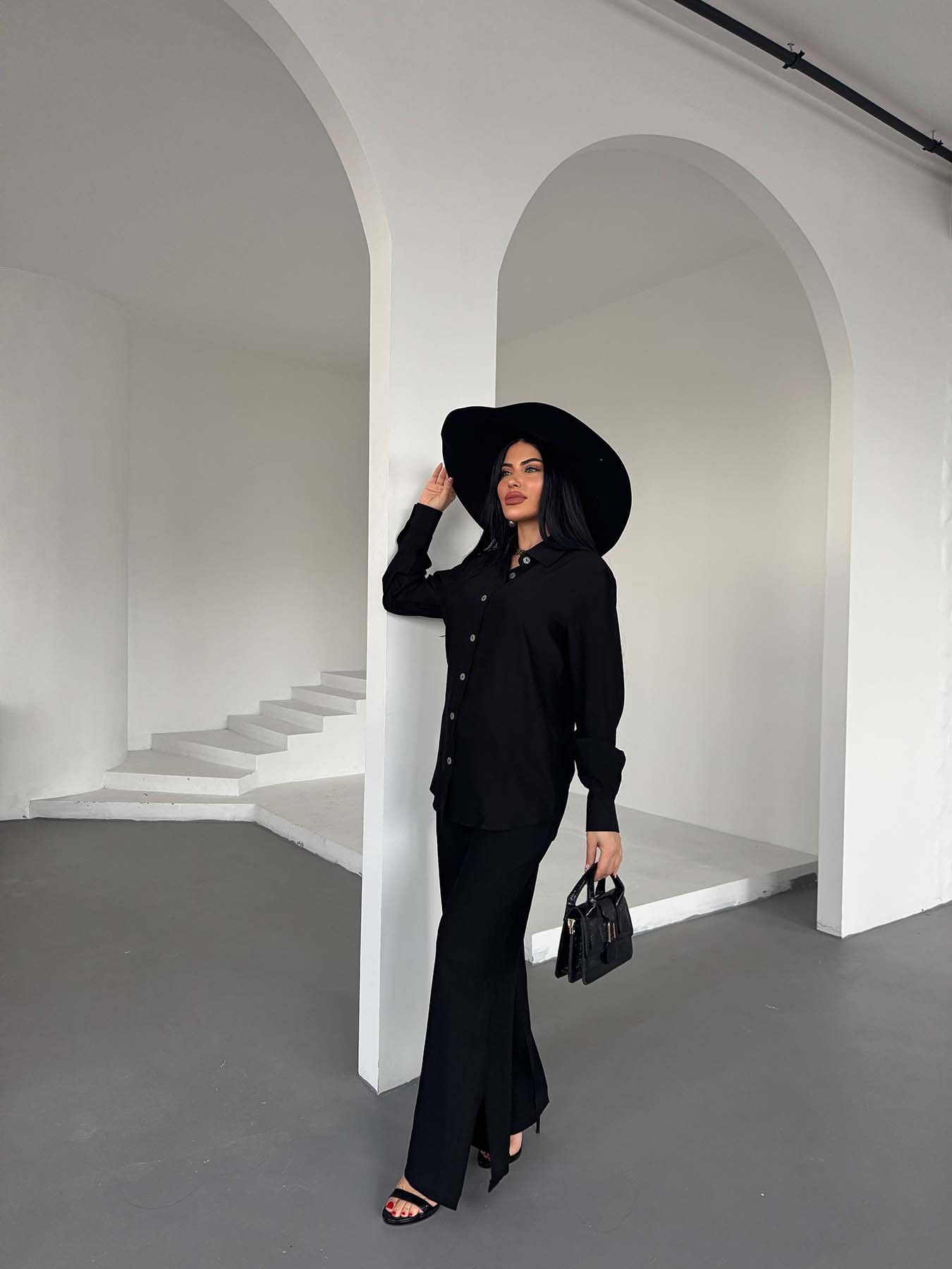 Siyah Çilek Gömlek Yırtmaçlı Pantolon Takım
