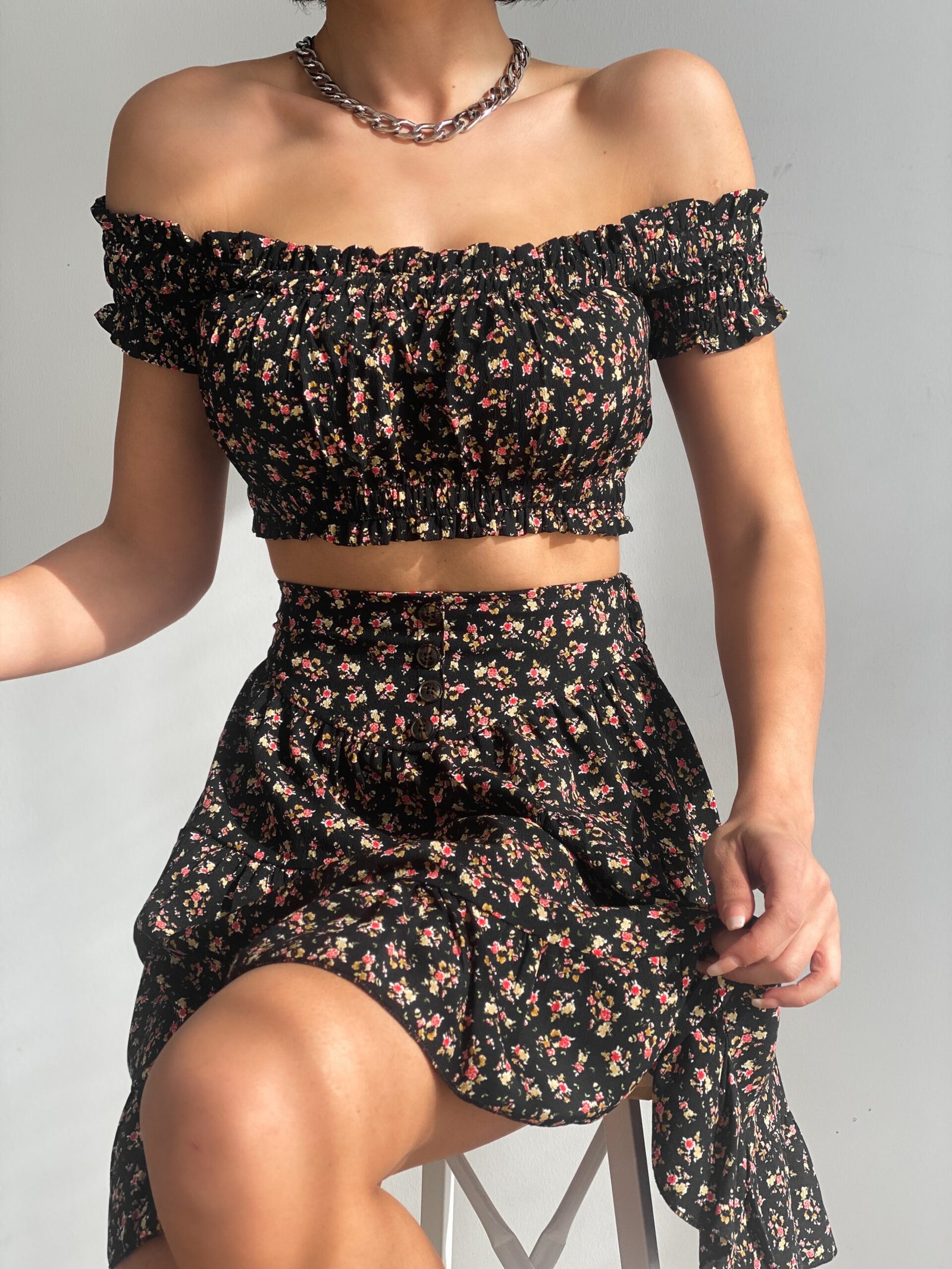 Siyah Çıtır Çiçek Desenli Büstiyer Etek Takım