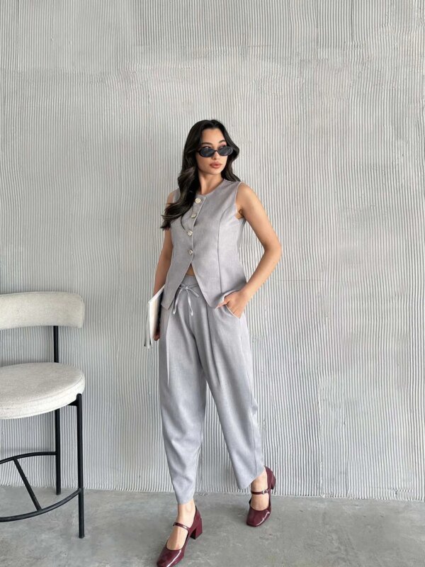 Gri Altın Düğmeli Yelekli Pileli Pantolon Takım