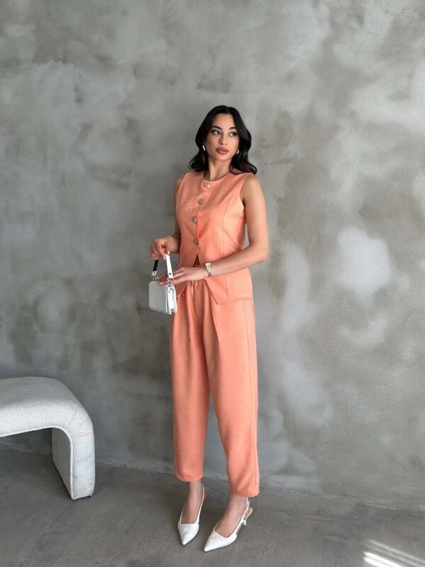 Turuncu Altın Düğmeli Yelekli Pileli Pantolon Takım