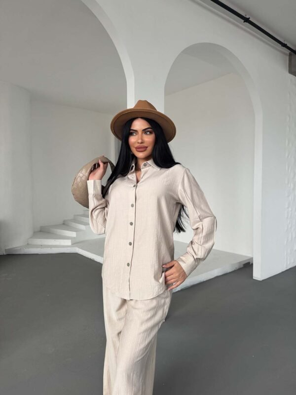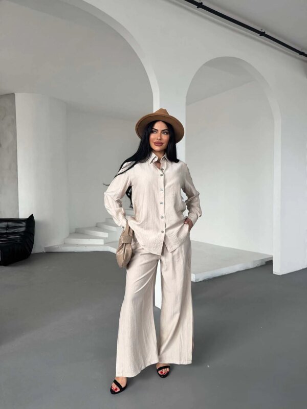 Bej Çilek Gömlek Yırtmaçlı Pantolon Takım