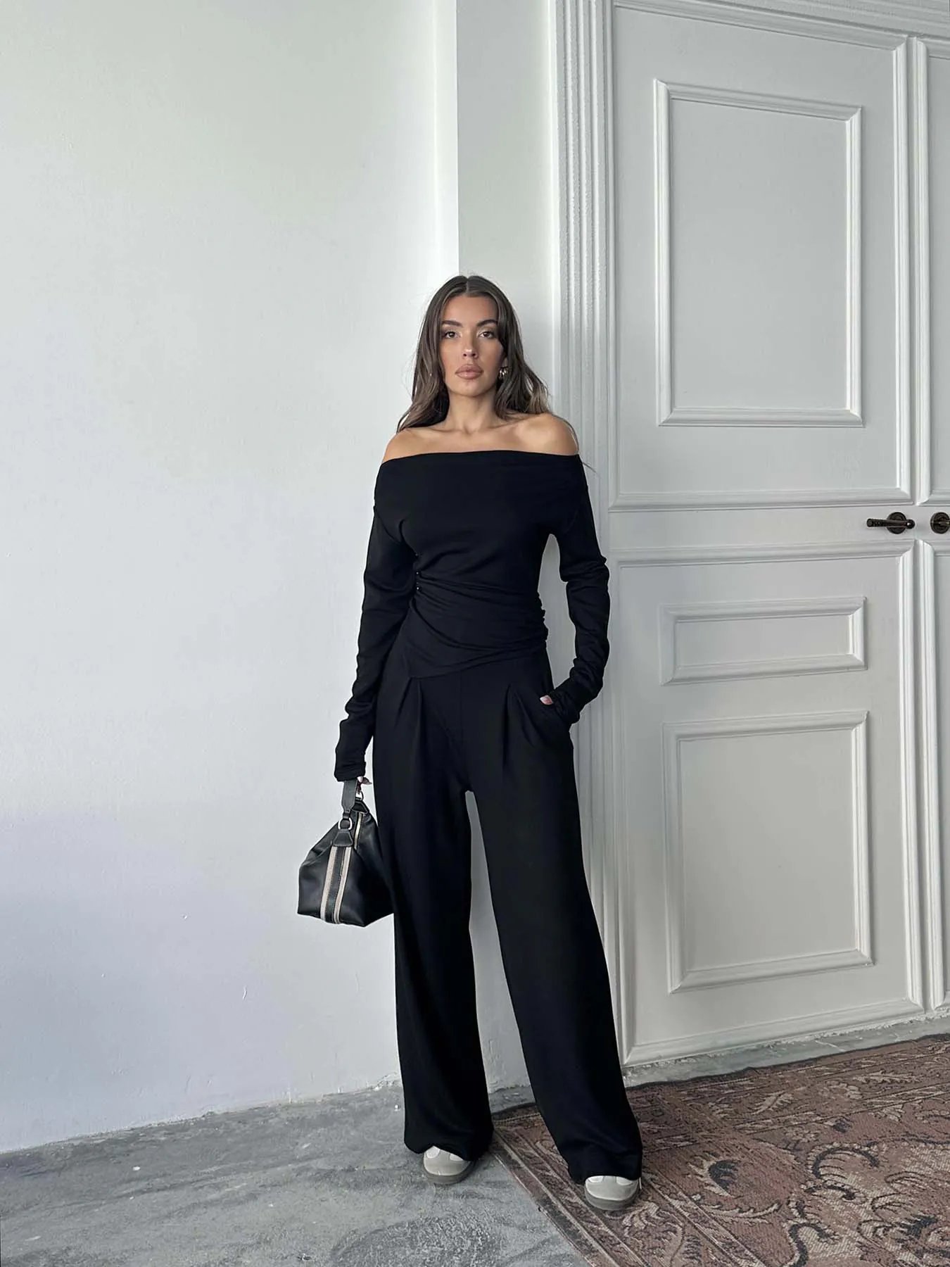 Üst: Drapeli, omzu açık ve uzun kollu tasarımıyla şık bir siluet sunar.