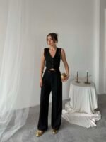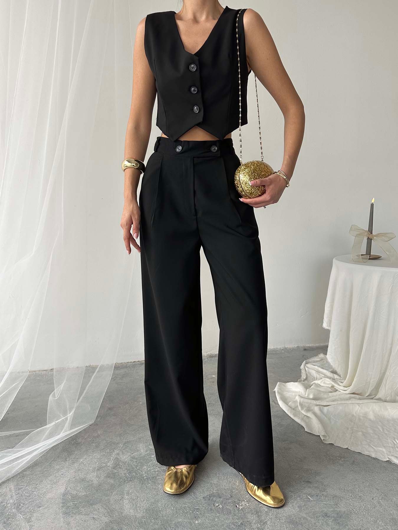 Siyah Poliviskon Çift Düğme Palazzo Pantolon