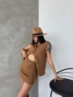 Bu kruvaze yelek ve etek takımı, mağazalarınızın koleksiyonuna sofistike bir dokunuş katıyor. Kaşe kumaşı sayesinde soğuk havalarda sıcaklık sunarken, oversize kesimiyle rahat ve modern bir görünüm sağlıyor. Kruvaze yelek detayı, klasik bir dokunuş eklerken, etek ile tamamlanan kombin, stil sahibi müşterileriniz için mükemmel bir seçenek oluşturur.