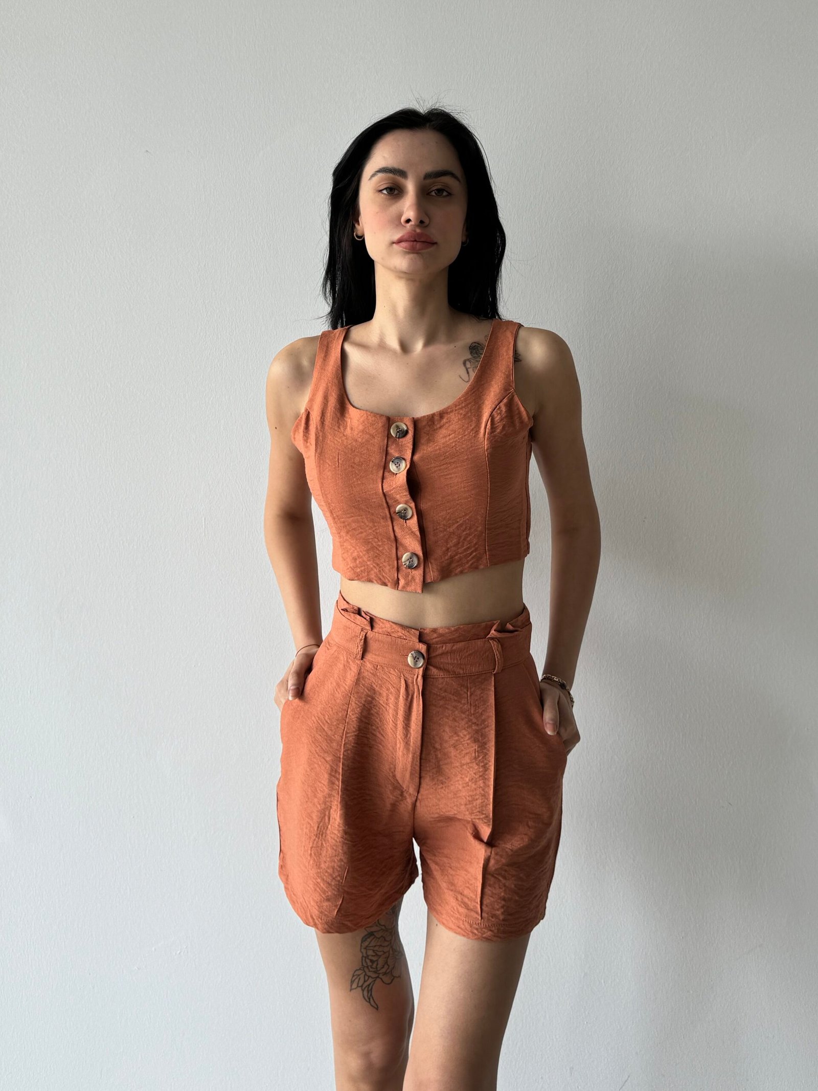 Bu keten şort ve yelek takım, doğal dokusu ve ferah kesimi ile sıcak günler için ideal bir tercih sunar. Ketenin nefes alan yapısı, rahatlık sağlarken; şort ve yeleğin uyumlu tasarımı, kombin yapmayı kolaylaştırarak modern bir görünüm sunar. Minimalist çizgileri ve sade tarzıyla bu takım, şıklığı sadelikle birleştirmek isteyen müşterileriniz için harika bir seçimdir.