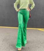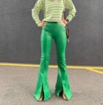Yeşil Ön Yırtmaçlı Deri İspanyol Paça Pantolon